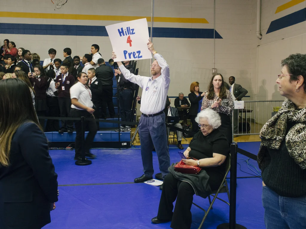 An attendee holds a sign saying "Hillz 4 Prez". November 2015.