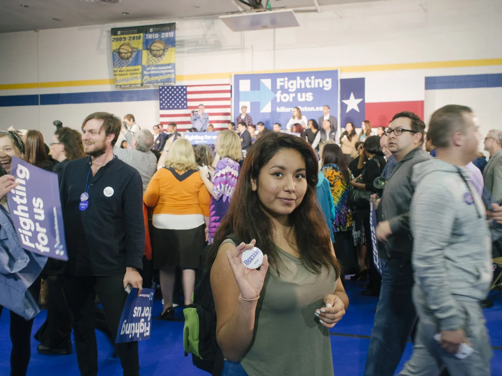 My friend Maria holds her Bernie Sanders 2016 campaign pin in support of Sanders' campaign. November 2015